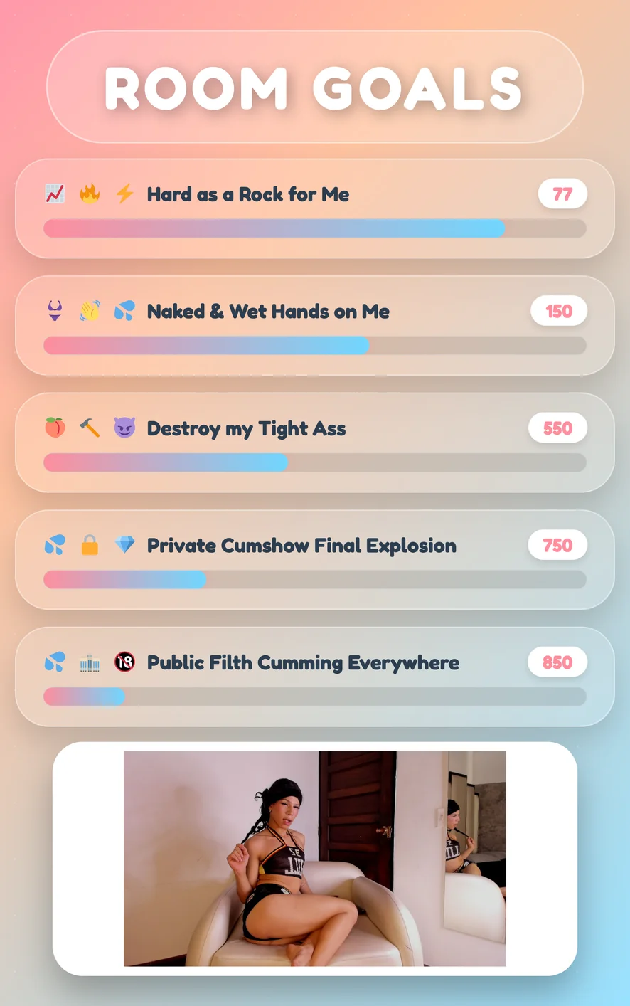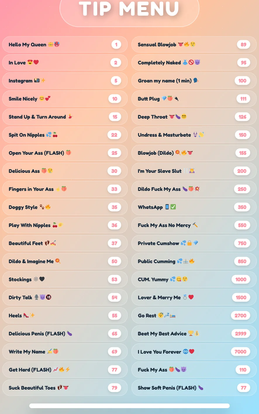 Erotický tanec, Prstění, Zezadu, Anál, Deepthroat, Anální hračky, Masturbace, Kuřba, Olejová show