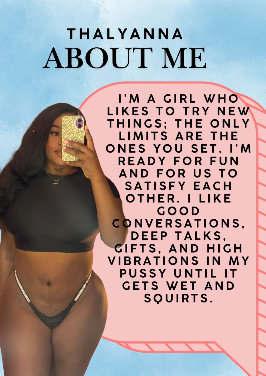 Je suis une fille qui aime essayer de nouvelles choses ; les seules limites sont celles que vous fixez. Je suis prête à m'amuser et à nous faire plaisir mutuellement. J'aime les conversations profondes, les cadeaux et les fortes vibrations dans mon vagin jusqu'à ce qu'il soit mouillé et que j'atteigne l'orgasme.