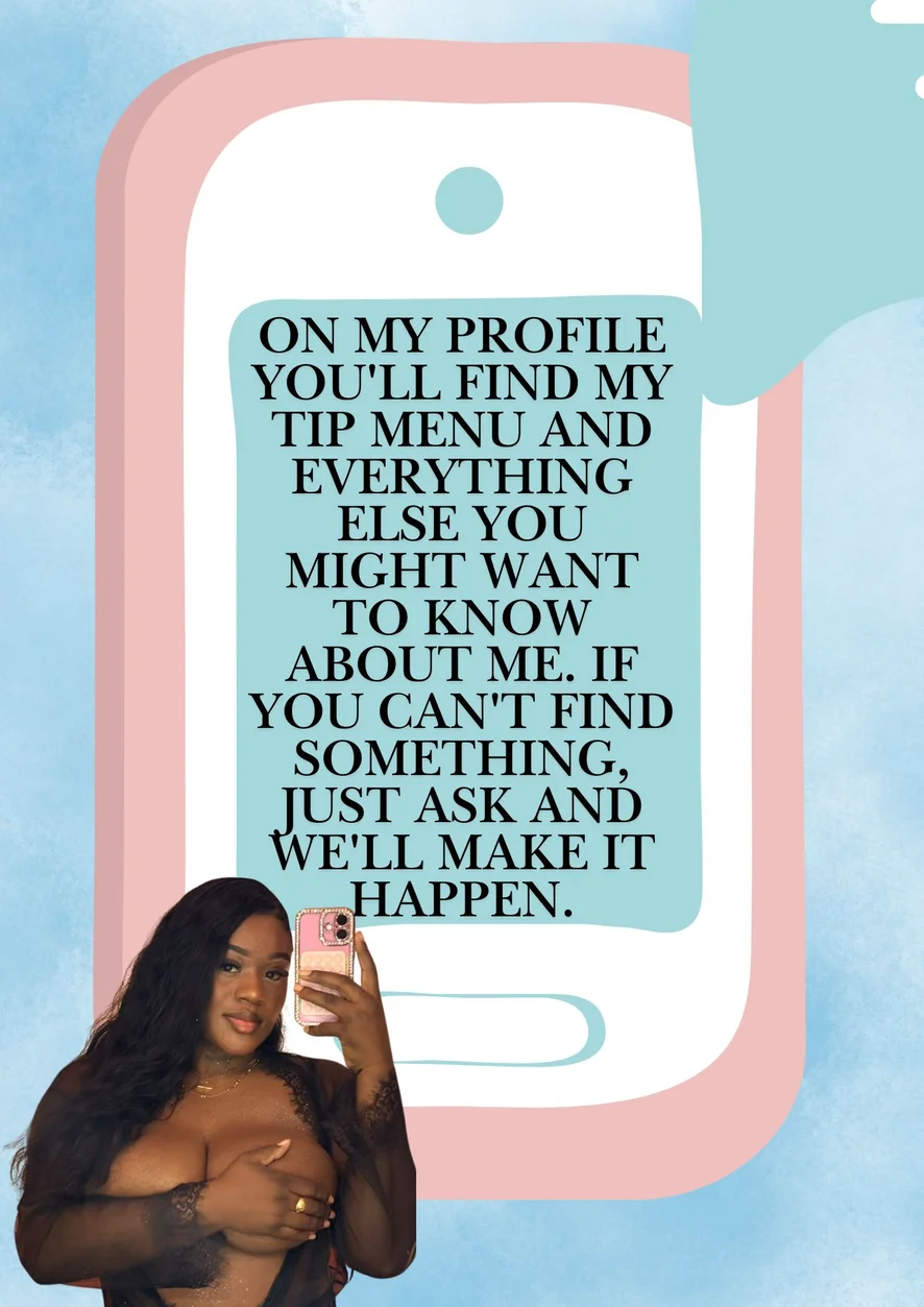 En mi perfil encontrarás mi menú de propinas y todo lo demás que quieras saber sobre mí. Si no encuentras algo, pregúntame y lo tendras