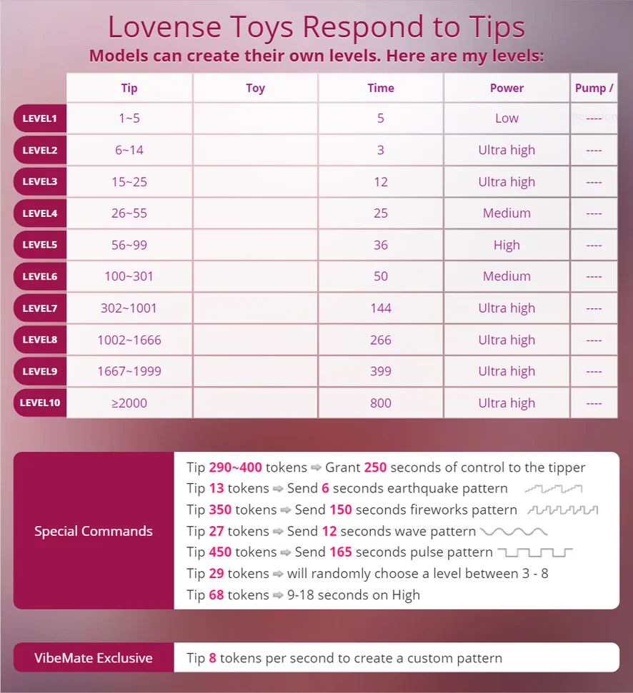 Ahegao, Erotický tanec, Hodnocení péra, Prstění, Kuřba, Dávení, Zezadu, Špinavá mluva, Striptýz, Sezení na obličeji, Pokyny k masturbaci, Podpatky, Nahoře bez, Twerk, Na koníčka, Anál, Připínací penis, Dildo nebo vibrátor, Footfetish, Gape, Mezi kozy, Orgasmus, Hardcore, Olejová show, Ženský výstřik